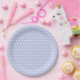 Papiertüte für weiße Babyduschringe auf blauem Hintergrund.
