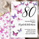 Cette jolie et fantaisiste invitation au 80ème anniversaire est parfaite pour une fête agréable et donnera un ton amusant et festif. Ce design est composé de papillons roses et violets, et est un choix féminin agréable pour un événement spécial pour célébrer un anniversaire marquant. Customisez pour votre propre année d'anniversaire, et cherchez "80" dans mon magasin pour voir la coordination des conceptions.