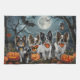 Entfesseln Sie den unheimlichen Geist mit diesem unheimlichen Halloween-Design, das eine Hundepackung unter einem dunklen, mondbeleuchteten Himmel bietet, umgeben von fliegenden Fledermäusen und glühenden Kürbissen. Ideal für diejenigen, die mit ihren wütenden Freunden eine Touch voller Furcht Liebe haben!