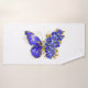 Bijoux, bleu, saphir, papillon aux fleurs pétillantes avec aile décorée de bleu, fleurs précieuses avec feuilles d'or sur arrière - plan blanc.