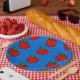 Diese Papierplatte mit roten Äpfeln auf Blau ist für Geburtstags-Party oder alle speziellen Spaßereignisse perfekt.