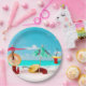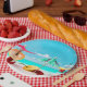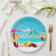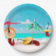 Drei Paprikaschoten mit rotem Chili am Strand. Sonniger Tag, blaues Meer, weißer Sand, Sonnenschirme und Sombreros. Zwei Paprikaschoten sind unter Strandschirmen schläfrig, die dritte im Wasser. Jede Stunde ist eine fröhliche Stunde am Strand. Sonne, Meer, Sand, Sombrero. Produkte und Geschenke im quadratischen Format