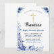 Elegante Flores y Cruz Para Niño Bautizo Einladung Celebre el bautismo de su hijo con amigos y familiares invitándolos con esta elegante invitación de bautismo floral en azul dorado y verde azulado. Este erkranko presenta una hermosa cruz de oro con un marco floral azul sobre un fondo blanco simple. Personaliza el texto y la fuente a tu gusto.