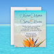Erschwingliche Hochzeitseinladungen mit tropischem Strandthema. Orangefarbene paradiesische Blume am Boden mit türkisfarbenem Wasser im Hintergrund des Strandes. Text-Vorlagen sind blau im Drehskript für die Namen des Ehepaares und gedruckter Text für alle Einladungsinformationen. Es gibt Platz, um den Empfang bei Bedarf aufzulisten. Kleinere, erschwingliche Einladungen, für eine preiswerte Hochzeit, werden auf dünneren Papier mit optionalen Umschlägen gedruckt, oder wählen Sie die 5x8 Größe (wird mehr Porto erfordern).
