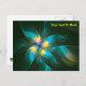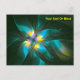 Ein buntes Fraktal, das einem Dschungelvogel ähnelt. Die Primärfarbe ist grün; Blau und Gelb sind ebenfalls hervorgehoben. Passen Sie Ihren eigenen Text an.