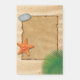 Altes Pergamentpapier mit Palmenblättern, Stein und Seestern auf Strand-Sand Hintergrund.