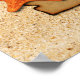 Altes Pergamentpapier mit Palmenblättern, Stein und Seestern auf Strand-Sand Hintergrund. Einfach Sommer: Sonnenuntergang, Küste, Sand, Muscheln, Meer, Schwimmen, Sonne, Surfen.