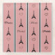 Paris-Illustration mit Eiffelturm und Herzdekoration und Pariser Textgestaltung auf schwarzem, weißem und rosa Streifen Hintergrund