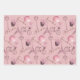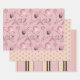 Dieses Trio aus Packpapier enthält "Ooo La" eine Collage von Gegenständen, eine Blume, Korb, Fahrrad, Lampenpost, Heißluftballon und der Eiffelturm, Set auf einem Hintergrund eines weichen rosa. Auch in der Collage sind die Phrasen: "Liebe ist in der Luft" und "Alles, was du brauchst, ist Liebe". Design Nummer zwei hat einen beigen Hintergrund mit einem Muster aus rosa Schmetterlingen. Das dritte Muster besteht aus rosa, dunkelbraunen, beigen und weißen Streifen.