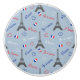 Nahtlose Pariser Textsanleitung mit Eiffelturm, dreifarbigen Herzformen und französischer Flaggendekoration auf blauem Hintergrund zum Valentinstag
