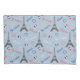 Nahtlose Pariser Textsanleitung mit Eiffelturm, dreifarbigen Herzformen und französischer Flaggendekoration auf blauem Hintergrund zum Valentinstag