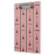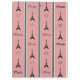 Paris-Illustration mit Eiffelturm und Herzdekoration und Pariser Textgestaltung auf schwarzem, weißem und rosa Streifen Hintergrund