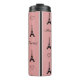 Paris-Illustration mit Eiffelturm und Herzdekoration und Pariser Textgestaltung auf schwarzem, weißem und rosa Streifen Hintergrund