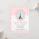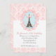 Dieses Design wird von Paris, Stadt der Mode und Licht ! Es zeigt den berühmten Eiffelturm im Vintagen Illustrationsstil, wo ein hellrosa Band graziös auf der Oberseite platziert, um eine geistliche Touch hinzuzufügen. Der Hintergrund besteht aus hellblauen und weißen Polka-Punkten und rosa-weißen Damast. Schließlich ist es von einem Vintagen Rahmen in rosa Wirbel gerahmt. Ändern Sie den Mustertext, indem Sie Ihre Party-Informationen eingeben.