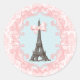 Dieses Design ist von Paris inspiriert, Stadt der Mode und Licht! Es zeigt den berühmten Eiffelturm im Vintagen Illustrationsstil, wo ein hellrosa Band graziös auf der Oberseite platziert, um eine mädchenhafte Touch hinzuzufügen. Der Hintergrund besteht aus hellblauen und weißen Polka-Punkten und rosa-weißem Damast. Schließlich ist es von einem Vintagen Rahmen in rosa Wirbel gerahmt.