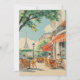 Eine charmante Vintage Illustration einer sonnigen Pariser Café-Terrasse mit Rattanstühlen, rot gestreiften Markisen und Blick auf den Eiffelturm. Die ästhetische und warme Atmosphäre der 50er Jahre macht es zu einem idealen Ort für nostalgische oder reisebezogene Dekoration.
