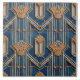 Ein symmetrisches Muster aus blau-goldenen Fliesen, mit einem sich wiederholenden Motiv aus stilisierten Ventilatoren und vertikalen Linien, das an das Art Deco Design erinnert. Die Fliesen sind in einem Gitter angeordnet, wobei jede Kachel mit einem zentralen blauen Feld mit goldenen Akzenten überlagert ist. Die Lüfter werden mit strahlenden Linien und einer geschossenen Kante dargestellt, während die vertikalen Linien ein Gefühl von Höhe und Struktur erzeugen. Das Gesamtbild ist elegant und raffiniert, mit einer Touch Vintagen Charmes. Die Fliesen scheinen aus Keramik oder Porzellan zu sein, mit einer glatten, glänzenden Oberfläche. Die Farbpalette wird von Blau- und Goldtönen dominiert, mit subtilen Ton- und Texturvariationen.
