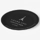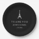 Dieser elegante, unbedeutende Hochzeits-Teller kennzeichnet modernen Arttext im Weiß auf einem schwarzen Hintergrund. Es gibt auch ein einfaches, elegantes weißes Eiffelturmbild. Eine Chicwahl für irgendein Franzose- oder Paris-Thema Hochzeit oder Brautparty. Der Teller sagt, dass "Ihnen" und den Braut- und Bräutigamnamen und Hochzeitsdatum danken Sie, aber Sie unter Verwendung der Schablone leicht personifizieren können.