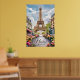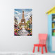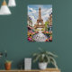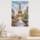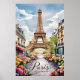 Ein Aquarellbild, das eine malerische Szene in Paris darstellt, mit dem Eiffelturm im Hintergrund, einer mit bunten Blume gesäumten Kopfsteinpflasterstraße und charmanten Pariser Gebäude. Das Bild zeigt die romantische und bezaubernde Atmosphäre der Stadt der Lichter.