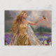 Fantasiekarte mit einer wunderbaren Fee in einem goldenen Kostüm, der einen bunten Papagei auf der Hand hält.