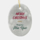 An der Vorderseite dieses Holiday-Ornament ist ein Bild eines bezaubernden spanischen Hundes Cocker, der eine Weihnachtsmannmütze trägt und in farbigen Weihnachtsbeleuchtung verpackt ist. Das Bild ist Set vor einem festlichen silbernen Hintergrund. Die Rückseite des Ornaments hat Text in Rot, Gold und Grün.
