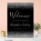 Les bordures du haut et du bas de cet élégant panneau sont décorées de faux parties scintillant argenté. Customisez le texte en écriture manuscrite gris argent et les polices serif sur un arrière - plan noir.