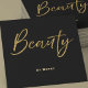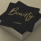 Un élégant carte de visite avec le mot "Beauté" sur le devant en parties scintillant dorée avec espace sur le dos pour votre nom et vos coordonnées. Cette conception inclut un code QR au dos.