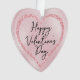 Ce ornement de conservation personnalisé présente un design de coeur rose doux et romantique. L'arrière - plan est un motif en feuille rose bébé avec un cadre cardiaque en parties scintillant rose qui borde le texte. Un message d'accueil "Heureuse Sainte-Valentin" est imprimé au centre dans une police de caractères élégante.
