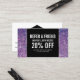 Coordonnée avec le modèle de carte d'affaires Pink Parties scintillant et Glamor Beauty d'ici 1201h. Une image arrière - plan violet riche et profonde fournit un cadre glamour à ce modèle de carte de référence personnalisable. Votre nom ou nom d'entreprise est élégamment stylisé dans une fausse plaque d'identification argentée pour un logo moderne sur le côté arrière. Personnalisez le texte pour votre propre promotion ou offre. Idéal pour les salons, les coiffeurs, les maquilleurs, les concepteurs de clous, les boutiques et plus encore. © 1201AM CREATIVE