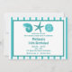 Diese lustige Party Einladung am Strand verfügt über eine Muscheln und einen Sternenfisch und anpassbaren Text auf einem aquamarinen und weiß gestreiften Hintergrund.
