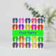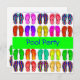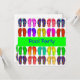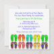 Große Sommerzeit Pool Party Einladung, in quadratischer Form gemacht. Fun Grafiken von bunten Flip Flops bedecken die Vorderseite der Einladung, mit einem hellgrünen Streifen, in der Mitte, mit blauem Text lesen Pool Party. Die Rückseite der Einladung hat einen blauen und grünen Text und zwei Zeilen farbige Flip Flops, am unteren Rand. Personalisieren Sie den gesamten Text, um Ihre Veranstaltung benötigt ideal für Pool-oder Strand-Party Anzug.
