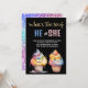 Die Niedliche, moderne und trendige Party Einladung des Eis Cream Gender Reveal zeigt eine Party Einladung-Karte mit einer Aquarellillustrierung von Eis in Waffeltönen in Rosa und Blau mit goldfarbenem Eiscreme. Im Text steht: "Was ist der Koffer? Junge oder Mädchen?" Ideal für ein Gender-Enthüllungs-Party im Sommer.
