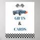 Unterschreiben Sie für die zweite Geburtstagsparty eines Kindes mit einem Rennwagenmotiv und einer Abbildung eines blauen Autos mit Flammen. "Geschenk und Karten" gemäß dem Absatz.