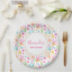 Party Papier Teller mit einem köstlichen und whimsical Muster. Herz, Liebe Briefe, Muffins, Tulpen und Kirschen bringen Freude und Glück in dieses niedliche kleine Muster. Hübsche Pastellfarben. Ein weißer Kreis mit einem Imitat mit goldener Folienabdeckung überlagert mit dem Text im Inneren.