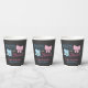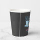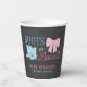 Niedliche Stiefel oder Bögen Geschlecht zeigen Papiertassen auf, die für Ihr Party personalisiert werden. Ein landesweites Thema zeigt ein mädchenhaftes rosa Bogen und blaue Cowboystiefel auf einem Kalkboard-Hintergrund.