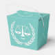 Kreative Juristen oder Jurist-Absolventen-Partei bevorzugt mit lustigen Maßstäben der Gerechtigkeit auf aquamarinem blauen Hintergrund.