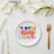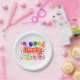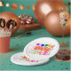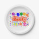 7" Runde Pappteller = optional, mit einer Zeichnung/Gestaltung des Wortes = Party, in der Farbe Rot und Weiß, mit einigen farbenfrohen Luftballons, Konfetti und Geschenkpaketen, = (Zeichnung/Design von P. J.M.) = darauf.