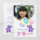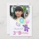 Party individuelle Name und Foto zum 3. Geburtstag mit einer süßen und niedlichen lila Teddybärprinzessin in einer hübschen, gelben, juwelengedeckten Krone und rosa, blauen und grünen Blume-Accessoires mit einem Haufen Ballons mit dem Wort PARTY auf ihnen. Die Personalisierung mit dem Foto und dem Namen des Kindes macht es besonders. Es ist ein lustiges königliches Thema für eine besondere Prinzessin. Originelles Design von Anura Design Studio.