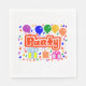 Weiß, =optional, Standard Lunch =optional, Serviette, mit einer Zeichnung/Design des Wortes = Party, in der Farbe Rot und Weiß, mit einigen farbenfrohen Luftballons, Konfetti und Geschenkpaketen, = (Zeichnung/Design von P. J.M.) = darauf.