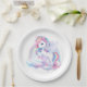 Party Teller zu einer magischen Geburtstagsparty mit einem bezaubernden Einhorn mit Flügeln in den Wolken auf einem Regenbogenuntergrund.