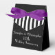 Was für eine wunderbare, personalisierte Gastgeschenk Box für einen 10. Hochzeitstag oder anderen besondere Anlass. Diese Fevor Box ist mit einem Muster aus schwarz-weißen Streifen auf schwarzem Hintergrund dekoriert. Auf der Vorderseite, Namen und Veranstaltung in weiß. Ein lila Band rundet das festliche Aussehen ab. Eine moderne, elegante und schicke Hochzeitsjubiläumsbox. Alle Rechte vorbehalten © 2015 Alan & Marcia Socolik.