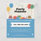 Ein Partyplaner Flyer mit einer Liste von Dienstleistungen und dekoriert mit Geburtstagskuchen, farbenfrohen Ballons, Partyhüten, Luftschlangen und Konfetti. Ideal für Menschen, die Veranstaltungen wie Kinder- oder Erwachsenengeburtstage, Produkteinführungen, Babypartys, Familientreffen, Hochzeitstage, Junggesellenabschiede, Themenpartys und mehr planen.