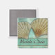 Zwei Muscheln auf blaugrünem Hintergrund mit leicht anpassbarer Braut- und Bräutigam-Namen. Perfektes Design für Hochzeiten in Urlaubsort, Hawaii, Tahita, Bahamas und mehr.