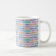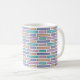 Ein spielerisches Pastellmuster mit abwechselnden Aqua-, lila-, Rosa- und Orangenziegeln unterschiedlicher Länge und einem lebendigen und skurrilen Mosaik.