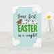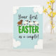 This greeting card features a soft pastel blue background like a clear spring sky, setting a gentle scene for two people celebrating together 🌷. Near the center, the message reads “Your first EASTER as a couple!” with “Your first” and “as a couple!” in flowing cursive-style lettering above and below. The word “EASTER” sits in large green letters with a white outline, drawing the eye and giving the design its main focus. Four simplified sheep-like animals rest along the tops of the green letters, leaning close as if sharing the moment like close friends 🐰. Three have creamy white wool, while one is warm brown, adding a small contrast that makes the group feel cozy and connected. Their round eyes and minimal features give them a sweet, calm look, like they’re quietly cheering the couple on. Pale, cloud-like shapes float in the corners, framing the text against the airy blue background. The green “EASTER” lettering is thick and outlined in white, with the animals perched evenly across the tops of the letters.