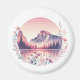 Whimsikale pastellfarbene Illustration von Yosemite's Halbkuppel, gerahmt von Wildblumen und einem reflektierenden See.