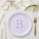 Sie können die pastellfarbene lila Hintergrundfarbe in diesem Gingham-Muster ändern. Löschen oder fügen Sie diesem Lavendel ein Monogramm und Weiß-karierte hinzu. Erstellen Sie Ihre eigene Babydusche mit einem Teller von 15 cm.