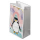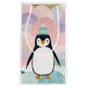 This charming illustration features a whimsical penguin centered against a backdrop of soft, overlapping semicircular hills. The palette is a gentle dreamscape of pastel pinks, lavenders, and mint greens, executed with a delicate watercolor texture that suggests a snowy, magical landscape. The penguin itself wears a cozy, patterned teal beanie, adding a touch of personality and warmth to the cool setting. Subtle gold leaf accents in the sky and on a floating celestial sphere provide a hint of fairy-tale elegance, blending minimalist character design with folk-art inspired patterns.