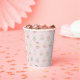 Complete your party table setting with these charming paper cups featuring a sweet dessert pattern. The cups display the full seamless tile graphic of cute bakery treats and whimsical frosting against a soft pastel pink gingham background with mint blue yellow accents. These adorable food illustration cups are perfect for custom party decor, ensuring your drinks are served with a festive touch of repeating sweethearts style at any celebration.
