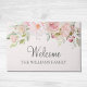 Fügen Sie Ihrem Eingang eine Touch Eleganz hinzu, mit dieser willkommenen Türe mit Aquarellfarben-Blume, Vintagen Rosen und blütenrosa Blumenakzenten in einem hübschen Drehbuchdesign.